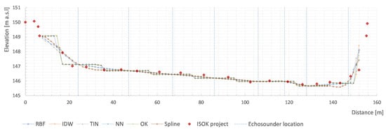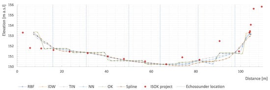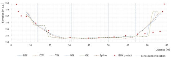 As observable in cross-section C (Figure 9, chainage 125 + 200), although the data points obtained from the echo sounder fit the ISOK data in the zones near to the river banks, where the navigation possibility was constrained, it is possible to observe large discrepancies (a similar problem was pointed out by Arseni et al. []). The interpolated profile is smooth when the NN, TIN, or Spline method was used, while the RBF, OK, and IDW methods generated steep profiles. Large gaps between the values obtained in the central part of the riverbed are less problematical than those obtained close to the river banks.