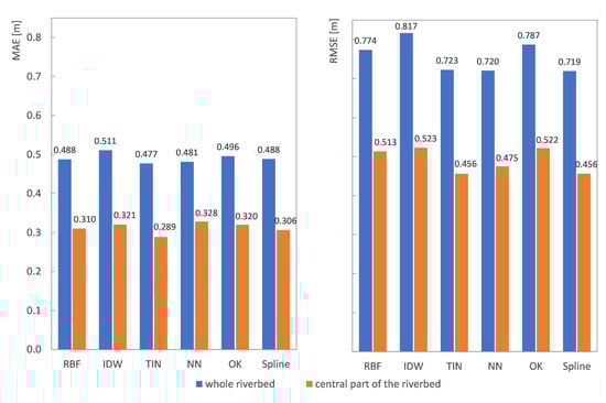 In Figure 12, one can compare MAE and RMSE values for the whole riverbed, including areas near to the banks in the middle section of the riverbed.