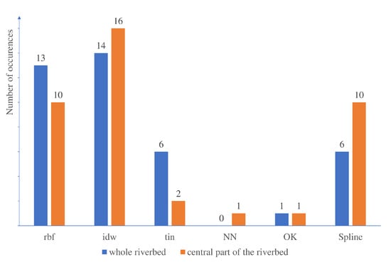 Maximum error values were identified for every cross-section. Both for the whole riverbed and its central part, the maximum errors occurred most frequently for the IDW interpolation method. As can be observable from the results of Figure 12 and Figure 13, the least frequency of maximum error in the cross-section is given by the NN and OK methods.