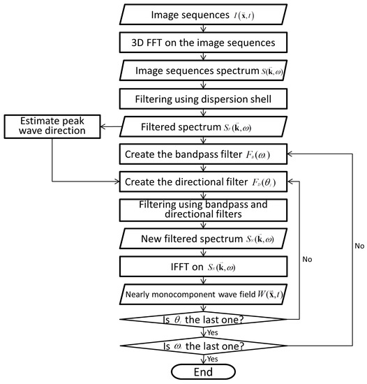Figure 1 shows the procedure for obtaining nearly monocomponent images of the wave pattern. In our study, the original wave image signals were decomposed into different nearly monocomponent signals by bandpass and directional filtering. The image sequences I ( x , t ) that present the image intensity at different spatial locations x = ( x , y ) and times ( t ) are transformed into the spectral domains S ( k , ω ) using the three-dimensional, fast Fourier transform (FFT). Note that computing the temporal and spatial gradients of the phase can yield both the wavenumber and the frequency of the moving periodic structure directly [22]. However, both the wavenumber and the frequency are sensitive to noise from image sequences. The short-term characteristics of wave records can be reasonably treated as nearly stationary [23]. Subsequently, we will point out that the duration of our radar image sequences is 183 s, and ocean waves can be deemed stationary within this duration. As a result, the frequency information is extracted from the spectrum instead of the estimation of the temporal gradient of the phase.