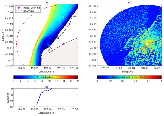 Figure 2 shows the layout of our study site, which is located in the coastal area of Tainan, Taiwan. Within the monitoring area, we collected survey bathymetry data that were measured by a single-beam echo sounder (Teledyne Odom Hydrographic Hydrotrac 200 kHz) from a boat. The resolution of the survey measurement is 0.01 m. The accuracy of survey data is 0.01 m + 0.1% of depth value. The maximum depth range can reach 100 m, which is suitable for the depth measurement in our study area. The colors in Figure 2a represent the survey bathymetry. The deepest survey water depth was 14 m, and the survey area is a part of the whole radar monitoring area. The influences of tides on depth determination in coastal areas were considered in our study. The mean tidal range in the study site is 1.24 m. To compare the estimated depth from radar with the survey depth from the echo sounder, both the radar-estimated depths and the survey depth were corrected using simultaneous in situ tide data. Figure 2b presents the bathymetry profile at a fixed latitude. The nearshore slope is approximately 0.01.
