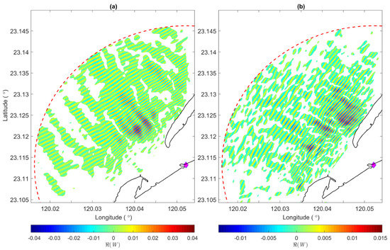 Figure 3. Results of ( W ( x ) ) using the filters with the directional band: (a). θ = θ p + 15 ± ( Δ θ / 2 ) ; (b). θ = θ p 15 ± ( Δ θ / 2 ) . Parts of the area within the spatial domain of ( W ( x ) ) are excluded when the strength is low ( | W ˜ ( x ) | < 0.2 W M ).