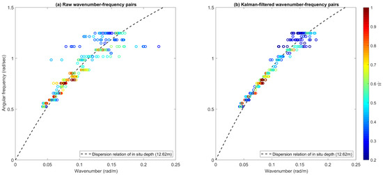 Figure 4. The relationship between estimated wavenumber–frequency pairs and the dispersion relation curve. (a). Raw wavenumber–frequency pairs; (b). Kalman-filtered wavenumber–frequency pairs. The colors of the wavenumber–frequency pairs indicate W ˜ , which is represented by the strength of the nearly monocomponent wave field.
