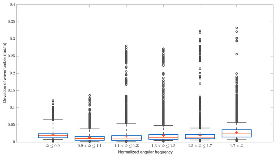 Figure 5. Deviations in the wavenumber at different normalized frequency conditions. The top and bottom of each box are the 75th and 25th percentiles of the samples, respectively. The line in the middle of each box is the sample median. The cross mark near the middle line is the sample mean. The upper and lower whiskers indicate the 100th and 0th percentiles of the samples, excluding any outliers, which are marked by circles.