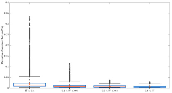 Figure 6. Relationship between the deviations in the wavenumber and W ˜ ( x ) . The definitions of different markers within the boxplot are the same as those in Figure 5.