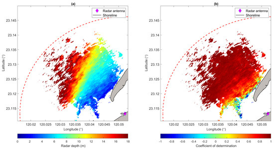Figure 7. (a). Bathymetry results are estimated from radar images. (b). Coefficient of the determination results between the estimated wavenumbers and the fitted dispersion relation curve.