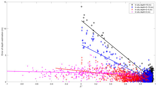 Figure 8. Relationship between the coefficient of determination and the error of depth estimation. The linear regression lines for each point category are also shown in this figure.