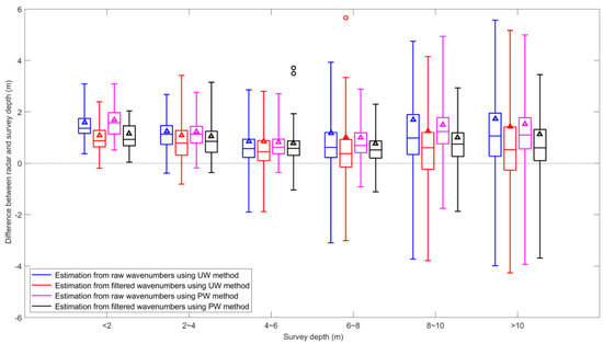 The scatter plot in Figure 9 shows that the Kalman-filtered wavenumbers are helpful for obtaining more reliable depth results. However, the accuracy of radar estimations seems to depend on the survey depth. Figure 10 presents the differences between radar depths and survey depths, which are classified into different conditions of survey depths. We observed that most of the radar-estimated depths are overestimated from the shallower area. As we pointed out in the data analysis section, the wavenumber–frequency pairs at higher-frequency bins, whose normalized magnitude is W ˜ ( x ) , are mostly weak and are excluded from the fitting process. The nonlinear effects are often unavoidable for the wavenumber–frequency pairs at lower-frequency bins, even though we removed the estimations whose R 2 values are too low. Large amplitude waves in shallow water are known to travel slightly faster than predicted by linear wave theory, which causes a slight overestimation of the radar depth [30]. This finding should explain the positive bias of radar-estimated depth estimation. The cases of shallow-water areas are often overestimated, regardless of whether Kalman filtering is applied.