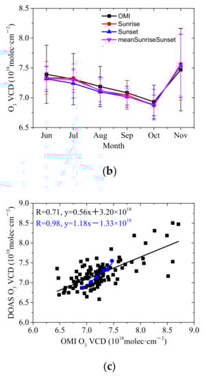 - The derived O3 VCDs matched well with the OMI satellite product, with a correlation coefficient R = 0.98 for the monthly O3 VCDs. One possible reason, for the differences between the two data sets, was the difference in the spatial and temporal representativeness of the O3 VCDs obtained by the zenith DOAS and the OMI satellite. The differences in O3 VCDs between sunrise and sunset are very small. The mean O3 VCDs from June to November 2020 are 7.21 × 1018 molec·cm−2 and 7.18 × 1018 molec·cm−2 at sunrise and sunset, respectively. The derived O3 VCDs show a considerable monthly variation in summer and autumn over the northern TP, ranging from a minimum of 6.9 × 1018 molec·cm−2 in October to 7.5 × 1018 molec·cm−2 in November.