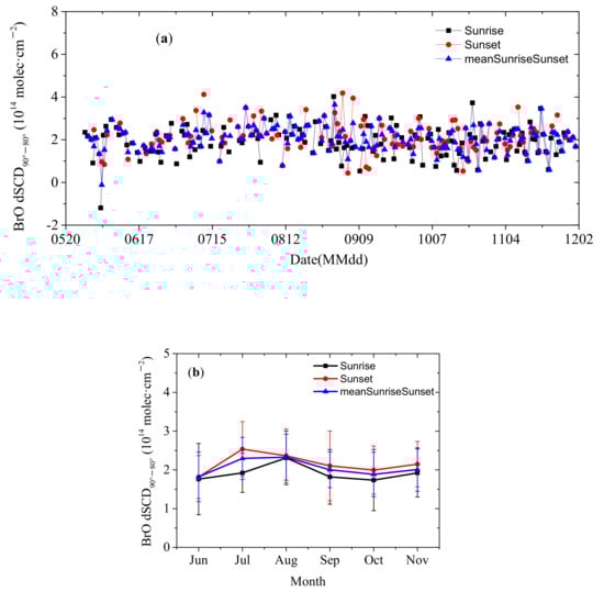 - The average level of BrO dSCD90°–80° at Golmud was 2.06 × 1014 molec·cm−2 during the period of June–November 2020 with the highest values in August and July for sunrise and sunset, respectively. Our results did not show a pronounced anti-correlation of the monthly variations between BrO and NO2, implying the importance of dynamical transport processes, rather than photochemical reactions between NO2 and BrO over the TP.