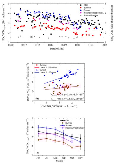 According to the aforementioned method, we obtained the NO2 VCDs at 90° SZA from 27 May to 30 November 2020 (Figure 10a). As expected, the NO2 VCDs at sunset are systematically higher than those at sunrise, with an average ratio of ~1.56, which is related to the photolysis of N2O5 []. We also show the total NO2 VCDs from the OMI-L3 cloud-screened product (OMNO2d V3, screened for cloud fractions below 30%) at the grid cell of the Golmud site by the black squares in Figure 10a. More details about the OMNO2d product can be found in our previous study []. There are some low outliers in the OMI product in summer from a statistical perspective. It is not clear that the outliers of the OMI product are caused by the influence of clouds, the complex terrain over the TP, or other factors. The overall temporal trends of the NO2 VCDs obtained from the ground-based zenith DOAS and the OMI satellite observations are in agreement. They gradually decrease with time during the effective observation period. Figure 10b shows the correlations of the daily NO2 VCDs between the two datasets. The correlation coefficient RSunset (=0.53) between the ground-based measurements at sunset and the OMI satellite observations is larger than that at sunrise (RSunrise = 0.24). The deviations between the two data sets are probably related to the differences in the spatial and temporal representativeness of the NO2 VCDs separately obtained by the two methods, and the accuracy of the zenith DOAS and OMI satellite retrieval products over the TP. Furthermore, we calculated the monthly means and standard deviations of the NO2 VCDs from June to November (Figure 10c). According to the larger standard deviations (uncertainties) of the OMI satellite products, the precision of the OMI satellite products is lower than the ground-based zenith DOAS observation. However, a similar overall monthly variation is found in both datasets (Figure 10c). With respect to the monthly NO2 VCDs averaged between sunrise and sunset, the maximum (3.40 × 1015 molec·cm−2) is found in July. The strong monthly variation of the NO2 VCDs is consistent with results from multi-year (1997–2016) monthly averaged stratospheric NO2 VCDs at Kiruna, Sweden, but the maximum is smaller than those observed in Kiruna []. For the daily NO2 VCDs, the correlation is smaller than for the monthly NO2 VCDs (RSunrise = 0.86 and RSunset = 0.97, see Figure 10d). The monthly NO2 VCDs observed by OMI are systematically larger (smaller) than those at sunrise (sunset) measured by ground-based zenith DOAS from June to September. For the measurements over the TP, the NO2 VCDs during the satellite overpass are better represented by the sunset observations.