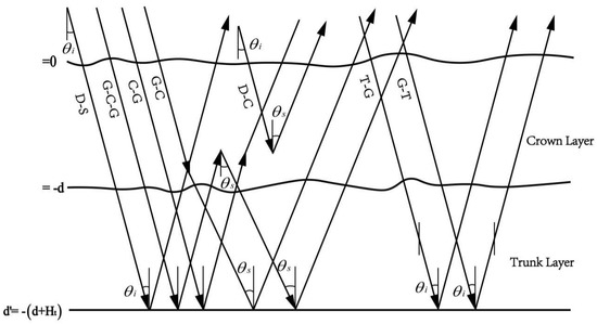 The Bi-MIMICS (Bitstaic-Michigan Microwave Canopy Scattering Model) model is based on the first-order solution of the radiative transfer equation. In the model, the forest stand is divided into canopy layer, trunk layer, and rough surface layer (Figure 1). The first-order scattering includes the single scattering of each layer and double scattering between layers. The canopy is simulated as a dielectric cylinder (representing needles or branches) and a disc (representing leaves). The trunk layer is composed of a uniform radius of perpendicularly facing dielectric cylinders. Regarding the circular polarization characteristics of GNSS-R, the Bi-MIMICS model needs to be modified by the method of polarization synthesis, so that it can calculate the scattering characteristics of any polarization. The improved model can calculate the scattering characteristics of any polarization under any observation geometry [48]. There are eight scattering mechanisms in the model: G-C-G, C-G, DC, G-C, G-T, DG, T-G, and the S-G.