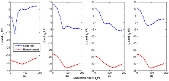 Comparison between coherent and incoherent scattering (a) RR polarization, (b) LR polarization, (c) VR polarization, and (d) HR polarization.