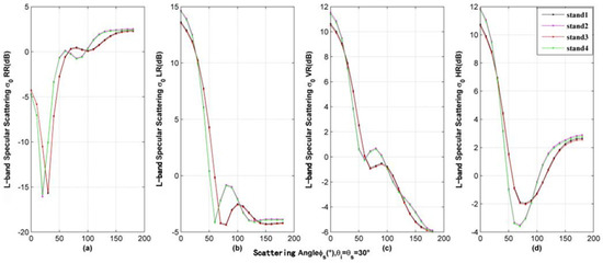 Specular scattering properties of four stands’ diameters at various polarizations. (a) RR polarization; (b) LR polarization; (c) VR polarization; (d) HR polarization.