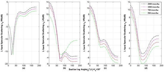 Specular scattering properties of various polarizations at different tree densities. (a) RR polarization; (b) LR polarization; (c) VR polarization; (d) HR polarization.