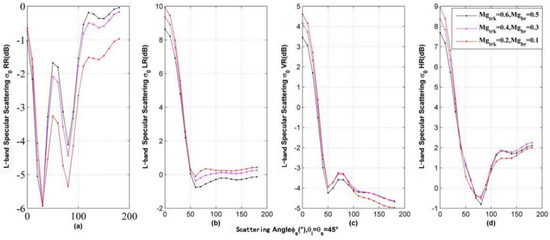 Specular scattering properties of various polarization for different vegetation water contents. (a) RR polarization; (b) LR polarization; (c) VR polarization; (d) HR polarization.