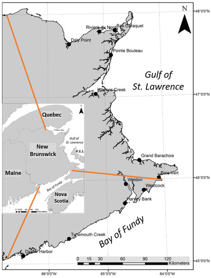Inset: location map of New Brunswick, Canada. Orange lines indicate the two coastlines on the Bay of Fundy and Gulf of St. Lawrence. Verification sites are named and position indicated.