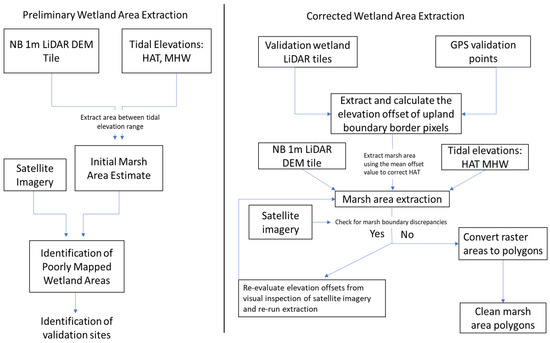 Due to the large area being analyzed, marsh area extraction was performed per DEM tile (10 × 10 km) along the NB coastline. Satellite imagery, including Planet Scope imagery (3 m pixel size), Google Earth imagery and base maps available in ArcGIS, were used to assess the accuracy of the mapping. Older Google Earth and ArcGIS basemaps were useful in some areas because marshes in the region have not changed significantly in the last decade, barring occasional anthropogenic disturbance of sites. All mapping and analyses were performed using ArcGIS 10.7.1. The workflow of the analysis is shown in Figure 2.