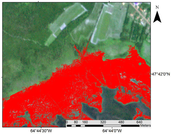 Mapping of salt marsh and other coastal features using LiDAR has been performed previously e.g., [18,19,20,22,23,30,31], though these studies largely involve mapping individual marshes and not large areas. While they analyze a much smaller area, this allows for the use of more complex mapping procedures that provide some insight into how some of the challenges encountered in our study could be overcome. Such uses include extracting legal shoreline boundaries [30], mapping marsh tidal creek networks [22] and using LiDAR in conjunction with other remote sensing data, such as multi- and hyperspectral imagery [18,20,22,23], among others.