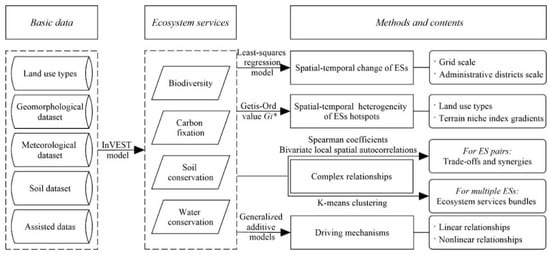 The framework of the methodology established in this study can be divided into five sections (Figure 2). First, the quantitative evaluation of ESs based on the InVEST model. Second, spatial–temporal change trend analysis of ESs by the least-squares regression model. Third, ESs hotspots identification and spatial–temporal heterogeneity analysis. Fourth, the determination of the complex relationships among ESs using spearman coefficients, bivariate Local Indicators of Spatial Association (LISA) and ecosystem services bundles (ESBs). Finally, driving mechanism analysis by GAM.