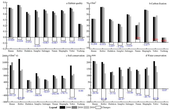 At the administrative districts scale, Beibei had the highest level of BI, followed by Banan and Yubei (Figure 4a). The highest average values of CF were also detected in Beibei, followed by Shapingba, Jiulongpo and Yubei (Figure 4b). The highest average SC and WC occurred in Banan, followed by Beibei and Yubei (Figure 4c,d). All ESs in Yuzhong were the lowest and far lower than those in other districts. It is worth mentioning that there were some increases in CF in Nanan, Yubei and Yuzhong. In addition to this, the general trends of ESs for all districts were descending. The maximum reductions of BI and CF were observed in Jiangbei. The dramatic decreases in SC and WC were observed in Beibei, Yubei and Jiangbei.