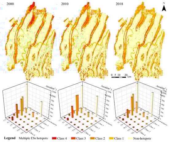 The results of hotspots analysis suggested clear characteristics in temporal and spatial distribution for multiple ES hotspots (Figure 5). During 2000–2018, the total area of multiple ES hotspots exhibited a slightly increasing tendency, with the area proportion increased from 31.55% (1726.45 km2) to 33.19% (1816.22 km2). Specifically, increases in class 1 ES hotspots were strongest. Class 2 ES hotspots also behaved a general increasing trend of increased first and then decreased. In 2018, the proportion of both to all ES hotspots reached as high as 53.46% and 32.16%, respectively. Class 3 and class 4 ES hotspots had a tendency to decrease, accounting for only 12.80% and 1.58% of all ES hotspots in 2018, respectively.