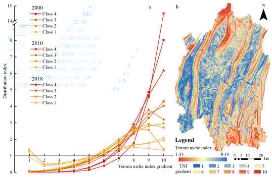 Distribution index (a) of multiple ES hotspots in terrain niche index gradient (b).