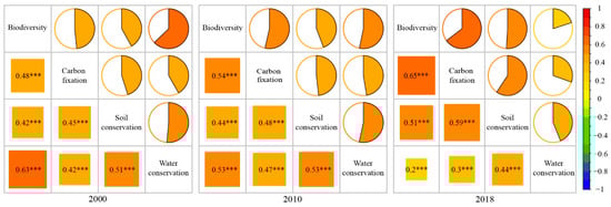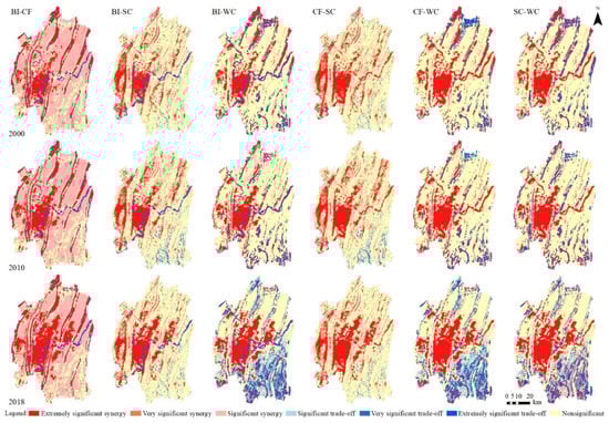 During 2000–2018, the significant positive correlations (Spearman coefficient: r > 0; p < 0.001) were found between all ES pairs in the entire study area (Figure 7). It demonstrated that all six pairs of ESs exhibited synergistic relationships. In 2000, there was a strongest positive correlation between BI and WC. The relationship between SC and WC was also strong synergistic. In 2010, the highest positive correlation was observed between BI and CF. Additionally, WC also had strong positive correlation with BI and SC. In 2018, the synergistic relationship between BI and CF remained strongest. Strong positive correlations were also found between SC with BI and CF. In addition, the correlation coefficients among BI, CF and SC showed a tendency to increase during 2000–2018, which indicated that the degree of synergies were gradually enhanced. With the relationship between BI and WC changed from strong correlation to weak correlation, the synergy was diminished. The relationships between WC with CF and SC showed a general weakening trend of slightly enhanced first and then weakened.