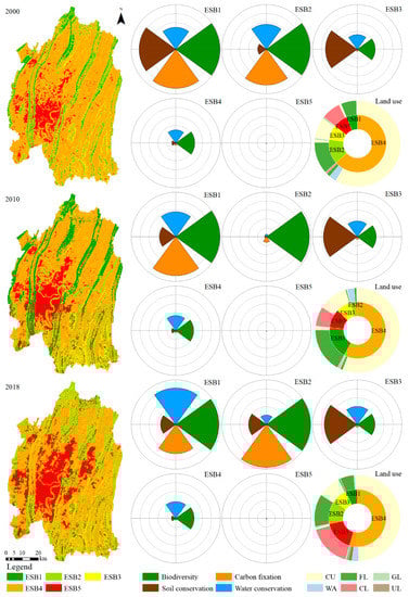 ESBs can reflect the aggregation and combination of multiple ESs on spatial and temporal scales, which can quantify the complex interactions among multiple ESs. ESBs were identified by K-means clustering algorithm []. To minimize the total error sum of squares, the number of initialized repeating runs and iterations were set to 150 and 1000, respectively [,]. The optimal number of clusters was determined by the ratio of the between-cluster sum of squares and the total sum of squares. The higher the ratio, the greater the difference between clusters and the smaller the difference within clusters. After series of trials and analysis, when the number of clusters was set to five, the ratios were the highest, which were 80.16%, 81.12% and 80.07% in 2000, 2010 and 2018, respectively. The five ESB types were visualized using petal plots, and the length of each petal represents the average of ESs [].