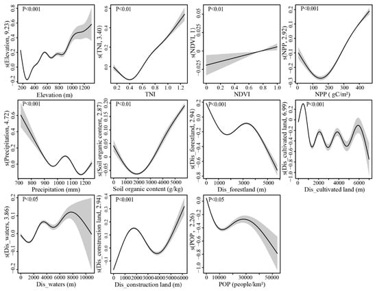 The results of GAM for ESs revealed the relative effect and importance of various driving factors, and the smooth functions showed the linear or nonlinear relationships between ESs and driving factors. The distance to forestland was the main influencing factor for BI with the highest F-value of 17.05, followed by the distance to cultivated land (F = 12.51) and elevation (F = 9.174) (Table S1, Figure 10). There was a decreasing trend generally in BI with the increasing distance to forestland. The observed appearance of the crest was closely related to waters with a higher BI, which were crisscrossed and interlaced with mountains. The CUACM was characterized by northeast–southwest trending parallel mountain ranges and west–east trending rivers, interspersing with flat valleys and urban groups. The complex spatial mosaic of landscapes resulted in a strongly nonlinear relationship between BI and the distance to cultivated land, waters and construction land. BI showed a general increasing trend of decrease first and then increased with increasing elevation and TNI. This was because waters were primarily located in the low TNI with low altitude and slope. Relevant studies had shown that waters created diverse and stable habitats for waterfowl and fish to forage, refuge and breed []. In addition, the same relationships were also observed between BI with NPP and soil organic content. NDVI had a very significant positive effect on BI, and an estimated degree of freedom equal to one confirmed the linear relation. There was a general negative relationship between BI and precipitation. One likely explanation for this may be that a large amount of precipitation had the potential to induce geological disasters in mountainous areas, which had a certain negative impact on BI. A similar negative correlation had been discovered in a study of the Yangtze River Economic Belt []. BI decreased nonlinearly with increasing population density. The ever-increasing population led to an expanding demand for natural resources and produces [], which caused dramatic interference with BI [].