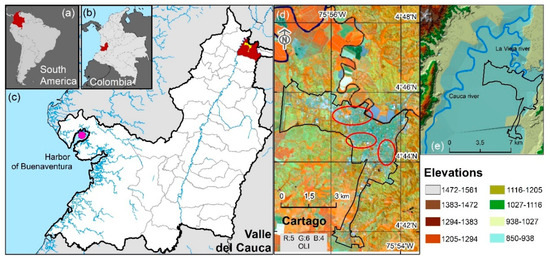 Location of the study area. (a) South America: Colombia highlighted. (b) Location of Valle del Cauca in Colombia. (c) Cartago in Department of Valle del Cauca. (d) Cartago, Landsat 8 OLI band combination (R:5, G:6, B:4). (e) Digital Elevation Model.