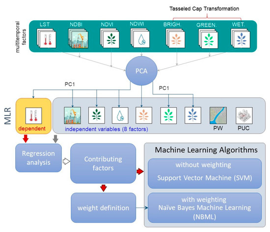 Understanding and quantifying urban temperatures in space and time are significantly relevant for city planners in defining policies that generate adaptation strategies to mitigate the SUHI effects. A very useful tool is Principal Component Analysis (PCA), a multivariate statistical technique that aims to preserve the total variance and reduce the dimensionality of the data set, while eliminating redundancy in the data [17]. Several authors have used this technique to detect spatial patterns of biophysical factors by synthesizing information from a set of images [18,19,20]. Multiple Linear Regression (MLR) analysis is an approach used to evaluate the relationship between independent and dependent factors [21]. This method has also been widely used to determine the relationship of various environmental factors [22,23,24].