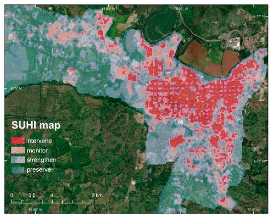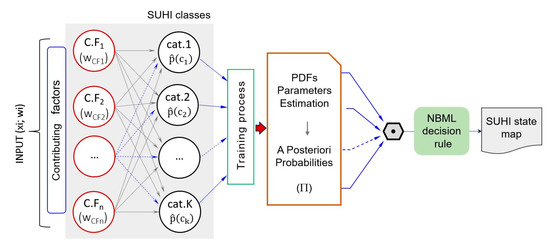 Equation (7) allows us to weight each environmental factor to generate the final SUHI product. The resulting map is generated according to the architecture shown in Figure 6, which is based on the NB decision rule. This approach categorizes the urban environment according to a specific condition and assigns a specific type of action based on each temperature category. This analytical procedure allows one to obtain a map that delimits the areas of different thermal intensities. The resulting areas are based on the spatiotemporal trends of the contributing factors, facilitating the management and application of measures to mitigate/adapt the SUHI phenomenon.