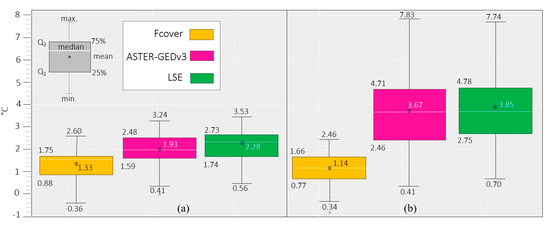 Sensitivity analysis of the three emissivity models is performed prior to retrieving land surface temperatures from the 37 Landsat images; the results of the assessment for the LST retrieved from L8/TIRS B10 (described in Section 2.3.4) are presented here. Figure 7 shows the differences between LST derived from the three models evaluated in this study (Fcover, AS-TER-GEDv3, and LSE), and these are compared with in situ LST. In this figure, the minimum, maxima, median and mean values are shown for (a) January 2019 and (b) September 2019. In both cases, the lowest differences agree with the LST values from our Fcover emissivity model.