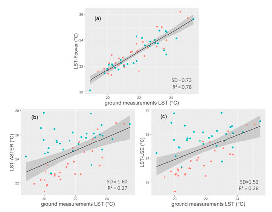 Regression analysis between LST from L8OLI/TIRS and that from ground measurements. Color code: Orange, January; Green, September (a) Fcover; (b) ASTER-GEDv3; (c) LSE model.