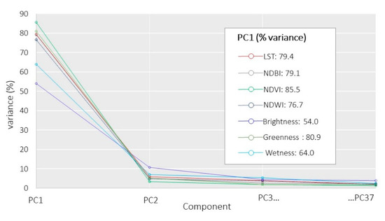 The PCA was carried out using all contributing factors during the period 2001–2020 (37 images for each variable). Figure 9 shows the contribution to the total variance of each PCA component. We can observe that the first PCA component (PCA1) of T-cap Brightness and T-cap Wetness provide a lower contribution to the total variance, with 54% and 64%, respectively. On the other hand, the rest of the variables show larger patterns of variability with only the first PCA component (above 75%).