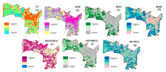 We employ the Jenks Natural Breaks grouping model [87] to identify the main groups and the inherent patterns that minimize the deviation of each class with respect to the mean value of the other groups. This method reduces the variance within the classes and maximizes the variance between classes. In this scheme, we obtain four groups for each factor, representing the spatiotemporal trends between 2001–2020. Figure 10 shows the resulting maps where the results for LST (Figure 10a) show the maximum concentration of temperature in densely populated areas, similar to the results of NDBI (Figure 10b). The LST results show gradual variations from low to high temperatures near the perimeter of urban areas. Regions with lower temperatures are mainly located in areas close to water bodies and dense vegetation. Vegetation areas can be identified in the NDVI results (Figure 10c). The NDVI and T-Cap Greenness maps Figure 10c,f have high similarity, while the T-Cap Brightness and Wetness maps Figure 10e,g lack spatial correlation with the thermal phenomenon. In the next section, we analyze the spatial correlations in more detail.