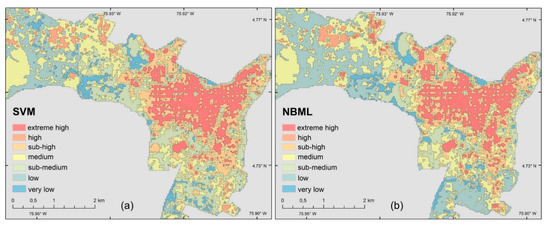 Finally, the SUHI phenomenon is segmented into different zones depending on the thermal intensity. Thermal value ranges follow the categories of Wang et al. [36], which consider the average temperature of the land surface and its standard deviation (SD). Segmentation provides a definitive SUHI product that categorizes the urban environment according to specific conditions. Here we test two different Machine Learning methods for classification; Support Vector Machine (SVM) and Naïve Bayes Machine Learning (NBML). Both SVM and NBML methods have shown in previous research their robustness for the characterization of various types of geospatial data [80,81]. The SVM method defines a separate hyperplane in a higher-dimensional space that optimally classifies the data. This method is particularly useful for solving nonlinear relations [82], and is available as open-source software in Orfeo ToolBox (OTB) at https://www.orfeo-toolbox.org/, accessed on 20 October 2021. The NBML technique is based on the Bayes theorem for conditional probability and assumes independence between predictors, variables, or features [83].