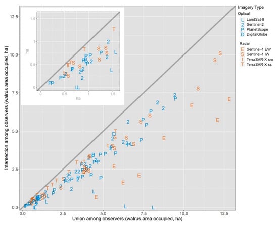 Variation among observers in determining both the location and size of walruses from satellite images. The area of 3-way intersection among the observers’ delineations of walrus aggregations in each satellite image (y axis) are plotted on the area of the geographic union of the observers’ delineations. A perfect 3-way spatial agreement would attain a 1:1 ratio. Symbols: as in Figure 2. Linear regression slopes for each imagery type are displayed in Table 1. One Sentinel-1 EW outlier was excluded from this graph: x = 20.11, y = 10.75).