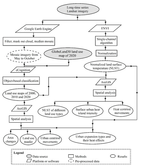 Satellite remote sensing data, such as imagery from Landsat, the Advanced Spaceborne Thermal Emission and Reflection Radiometer (ASTER), the Advanced Very High Resolution Radiometer (AVHRR), and the Moderate Resolution Imaging Spectroradiometer (MODIS), provide thermal infrared bands and spatially explicit earth observations over long-term periods in a comparable and repeatable manner [13,14,15]. Due to their relatively high spatial resolution and long time-sequenced data, Landsat series have become a common measure for characterizing urbanization and its heat effects [11,16,17]. Lu et al. [18] summarized methods to extract impervious surface areas from satellite images, concluding that object-based approaches are preferable for reducing the heterogeneity of the urban landscape, and that Landsat images are valuable for long-term comparisons. Aina et al. [19] used time-series Landsat images to map impervious surfaces and analyzed the urban landscape through change analysis and determining expansion types. As a direct surface phenomenon, the land-use change from natural land cover to impervious surfaces was a common perspective of remote sensing-based monitoring of the urbanization. Namely, the classification of impervious surfaces from Landsat imagery commonly represents the first step. Moreover, an object-based backdating approach based on existing mapping efforts, with a consistent classification scheme, was able to improve the accuracy by decreasing pseudo changes and heterogeneity [18,20]. Then, urbanization patterns were conventionally characterized via the spatiotemporal analysis of impervious surfaces. This type of analysis involves studying areal changes, spatial distribution, and conversion from the land-use transfer matrix; expansion types from expansion index calculations; and directions based on spatial centroid movements [14,21,22,23]. After that, the linkage between land-use changes and local thermal patterns was historically determined in one of two ways: (1) a direct temperature comparison between impervious surfaces and other land-use types or a comparison between temperature at different distances from the city; and (2) indirect analysis based on the temporal phenological changes of urban plants, with the former method being more popular [11,24,25]. Du et al. [26] adopted Landsat-based impervious surface mapping and land surface temperature (LST) retrieval and analyzed urban expansion and its heat-island effects using a transfer matrix and buffer analysis, along with a discussion of driving forces. Estoque et al. [27] conducted a correlation analysis between the density of impervious surfaces or green space and LST and compared the mean LSTs of different sizes, shape complexities, and aggregations of patches of impervious surfaces and green space to quantify the urban heat effect based on Landsat images. Roy et al. [17] assessed land-use dynamics based on Landsat images using areal changes and type conversions and linked the spectral indices of urban expansion to LST through linear regressions. The generalized single-channel algorithm is a mature method with wide applicability that is used to accurately map fine-resolution LSTs [26,27]. Overall, previous studies have closely analyzed the relevant classification methods, the spatiotemporal patterns of urban expansion, the surface urban heat island effects, and the driving forces [24,28,29]. However, there remains a lack of studies relating urban expansion types to local heat effects.