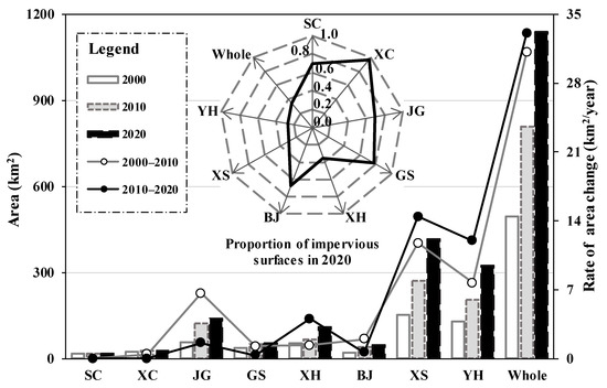 - The impervious surface expansion of Hangzhou City was mainly concentrated in the northeast of the city with flat terrain. In 2020, the area of impervious surfaces totaled 1139.29 km2, with the majority being in farmland, water, and forests. The annual growth rate was 31.16 km2/year from 2000 to 2010 and 33.07 km2/year in the last 10 years.