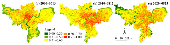 The LST was retrieved based on the Landsat imagery and the generalized single-channel algorithm. In detail, the radiative transfer equation was utilized to estimate the surface temperature from the thermal infrared bands of Landsat-5 TM (band 6) and Landsat-8 (band 10). The retrieved LSTs of 2000 and 2010 were consistent with the temperature products from the DATABANK Remote Sensing Data Engine (http://databank.casearth.cn/, accessed on 13 January 2021), the errors of which were below 2 K [42]. Due to the lack of LST products in the summer of 2020 and insufficient weather station data in the study area, the LST in 2020 was not validated in this study.