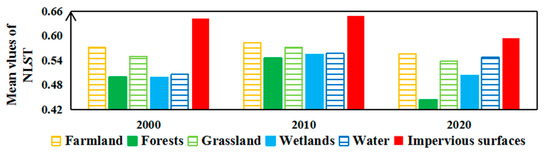 The NLST showed dramatic spatiotemporal variations. The increasing distribution of high values indicated the warming environment of Hangzhou City (Figure 6). Overall, irrespective of the outlying smallest values of NLST in 2020 due to the cloud cover, especially in the northwestern and southern forests, spatial variations in surface temperature decreased during the two phases of 2000–2010 and 2010–2020 (Figure 6 and Figure 7). Impervious surfaces had the largest mean values of NLST, followed by farmland (Figure 7). However, the smallest mean values of NLST were observed for the wetlands in 2000 and for forests in 2010 and 2020.