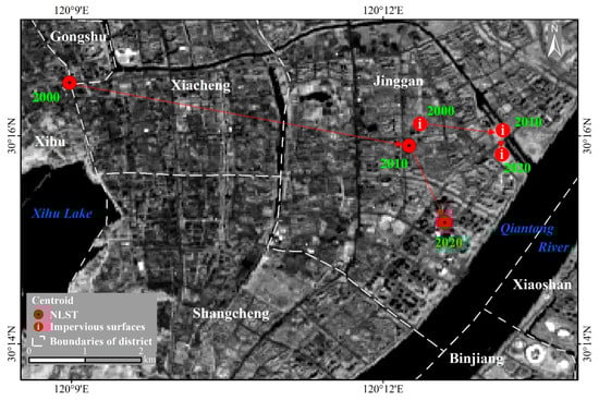Centroid movements for NLST and impervious surfaces in Hangzhou City from 2000 to 2020. The background represents the band 5 (near infrared) of the mosaic Landsat-8 OLI imagery used for the classification.