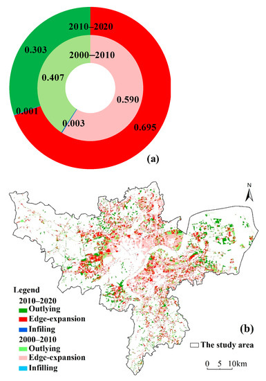 The results illustrated that edge-expansion was the dominant type of urban growth from 2000 to 2020, while infilling expansion was sparsely distributed (Figure 9). This result agrees with prior studies on urban expansion from 2000 to 2015 and can be explained by strip development with subjection to the southwestern mountains and the Qiantang River [54]. A previous study concluded that outlying growth, followed by edge-expansion, was the primary type of urban sprawl from 1995 to 2005 in districts that were built earlier [55]. It can be inferred that the urban expansion of Hangzhou City transformed from outlying-oriented to leading edge-expansion (Figure 9a). Infilling expansion was lowest because of the high land use efficiency in Hangzhou City, which featured few gaps or holes across urban areas.