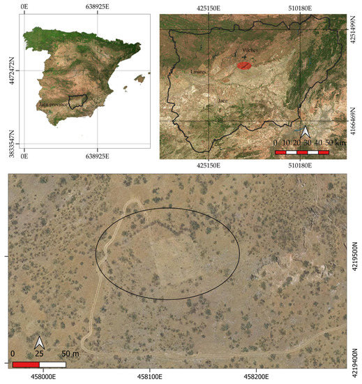 The area chosen to evaluate this methodology was the Giribaile archaeological site in the present-day region of Andalusia, in the south of the Iberian Peninsula, specifically in the municipality of Vilches [1] in the El Condado region of Jaén province. Located near the main communication routes (Figure 1), the archaeological site is on a plateau overlooking the Guadalén and Guadalimar river valleys at the foot of the Sierra Morena mountains. With more than 14 ha of fortified plateau, it is one of the most important archaeological areas in the Alto Guadalquivir region. During protohistory it was part of the political territory of Cástulo, which would have acted as its capital. The most recent research suggests that it may have been an ex novo foundation from the mid-fourth century BC, perhaps resulting from a political agreement with the local aristocracies in anticipation of the Punic presence in the Sierra Morena mining region. In this regard, it is necessary to take into account the proximity of Baecula [2], the scene of one of the main battles in the final stages of the Second Punic War, in which Iberians, Carthaginians, and Romans were involved.