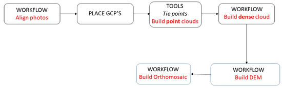 Workflow followed for the processing of the UAV photos. The menu in which the tool used is located is in capital letters, the submenu is in italics and the name of the tool is in red. The blue rectangles indicate the steps followed to obtain the orthophotography.