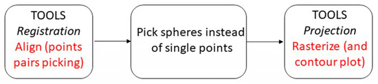 The Foss CloudCompare software, Version 2.11.2 (Anoia) was found to offer a simple solution to this question, following the workflow shown in Figure 6.