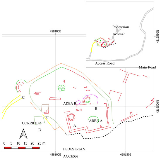 Joint interpretation of the results obtained after visually analysing the results of the RVT analyses. (Top right) General view of the site with the identified communication routes. (Central area) Detail of the identified structures. Coordinates referred to EPSG: 25,830—ETRS89/UTM Zone 30N.
