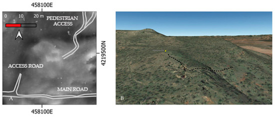 (A) Possible access routes identified in the DEM generated with the IGN LiDAR data. The Main Road, Access Road and (possible) Pedestrian Access can be appreciated. In this case only the LD_R_M10-20_DI1_A15_OH1.7 technique is shown because no new data was revealed in the others. (B) Proposed Pedestrian Access route using Google Earth Pro. Coordinates referred to EPSG: 25,830—ETRS89/UTM Zone 30N.